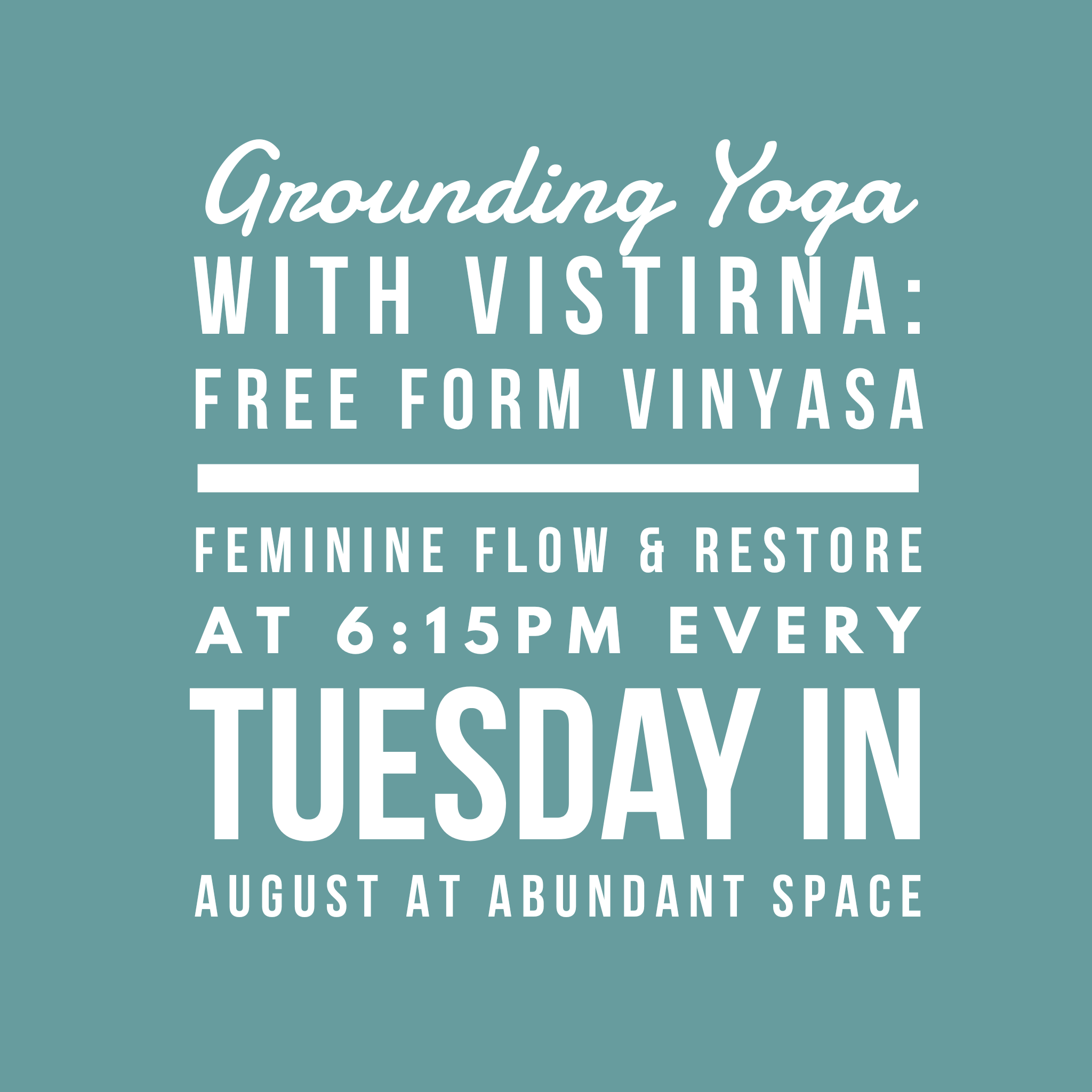 Join us for Grounding Yoga at 6:15pm! Connect with your Divine Feminine, Mother Warth, the innate healing capacity when your body is in balance and on your dharmic path of your highest purpose, body yantra (body-based meditation), ayurveda, moving meditation vinyasa, restorative yoga, free-form movement, essential oils, incense, community & connection, herbal chai tea.